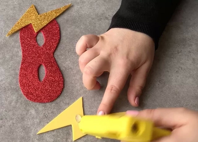 С помощью скотча и вырежьте их ножницами. Приклейте маленькие молнии к разным сторонам маски.