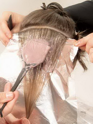 - Затем отделяем следующие пряди (также шириной 1 см), методом штопки выделяем тоненькие прядки и, также подложив под них фольгу, наносим осветляющую смесь (№2). После чего заворачиваем эти пряди в фольгу, а оставшиеся пряди также окрашиваем смесью №1. Далее вновь отделяем новые пряди с левой и правой стороны (шириной 1 см), также методом штопки выделяем тоненькие прядки, подкладываем под них фольгу, окрашиваем смесью №3 и заворачиваем их в фольгу, а оставшиеся пряди снова окрашиваем смесью №1. Затем отделяем пряди шириной 1 см, которые окрашиваем смесью №1.