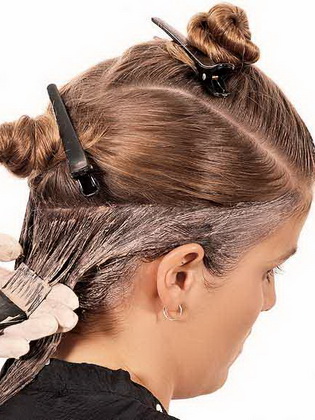 - Смешиваем средне-русый оттенок с 3%-м окислителем и наносим на корни волос (2-3 см), начиная с нижней затылочной зоны. Пряди отделяем при этом горизонтальными проборами и, накладывая прядь на прядь, постепенно продвигаемся к теменной и височным зонам.