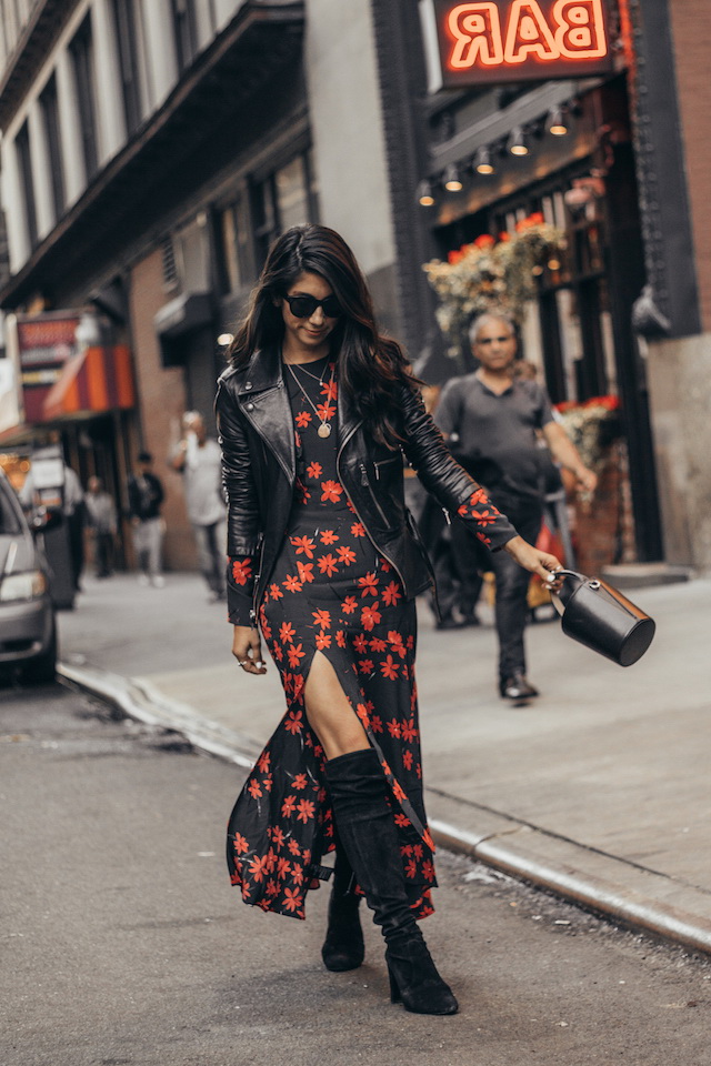 Чтобы привнести нотку гламурного рока в свое маленькое платье с цветочным принтом, выберите такое дополнение, как черная кожаная куртка perfecto.