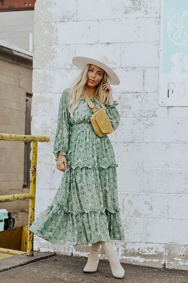 Как и в случае с коротким нарядом в цветочек, черные байкерские или ковбойские сапоги обеспечат очень модный контраст с длинным воздушным платьем.