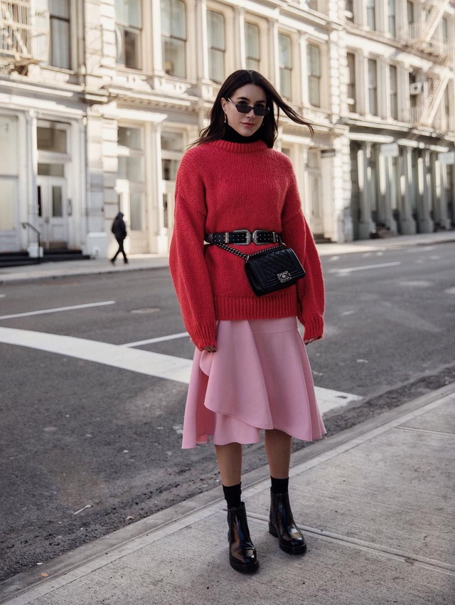 Подвяжите свитер поясом, формируя завышенную талию. Завершите образ кроссовками или ботильнами.