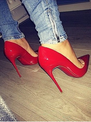 Наверняка в гардеробе каждой модницы найдется одежда серых и бежевых тонов, джинсы или темные брюки. Эта одежда сама по себе может смотреться невзрачно, но пара красных лодочек поможет придать женскому облику яркости.