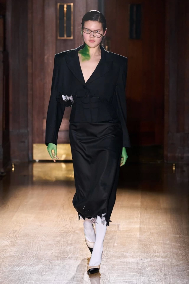 Затем он представил коллекцию, в которой бюстье повторяют эстетику смокинга, а платья распахнуты веером.