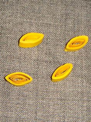 - Достаньте ролл из шаблона, подклейте кончик клеем, придайте форму глаза, прижав слегка руками с двух сторон, чтобы края элемента стали заостренными. У вас должно получиться 7 таких «глазок».