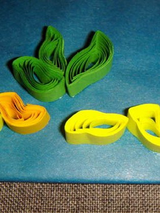 - Из шаблонов зеленого и желтого цвета необходимо сделать фигурки под названием «полумесяц» и «волна». Чтобы сделать полумесяц, деталь необходимо вогнуть во внутрь. Чтобы сделать волну, один край выгнуть в одну сторону, другой – в противоположную.